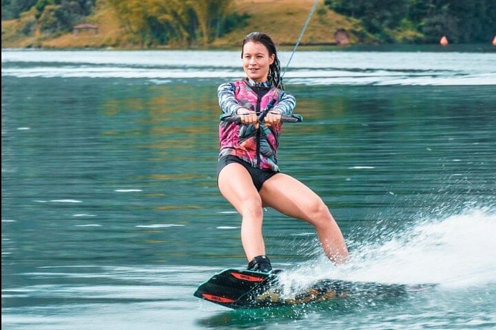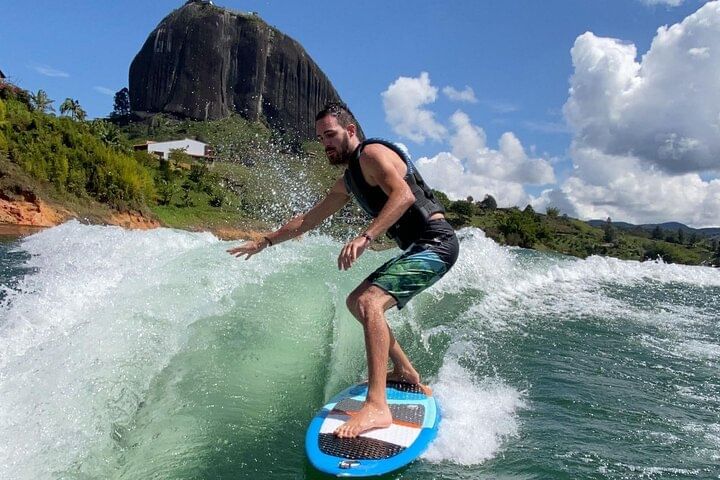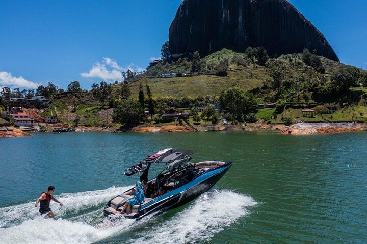 Experience the thrill of wakeboarding in the stunning setting of Guatape's expansive lake. Feel the rush as you carve through the crystal-clear waters, surrounded by the breathtaking beauty of lush green hills and scattered islands. Whether you're a seasoned pro or a first-time rider, this giant lake offers the perfect canvas for an adrenaline-pumping adventure. Glide, flip, and soar as you embrace the sheer joy of wakeboarding in the heart of Colombian paradise.